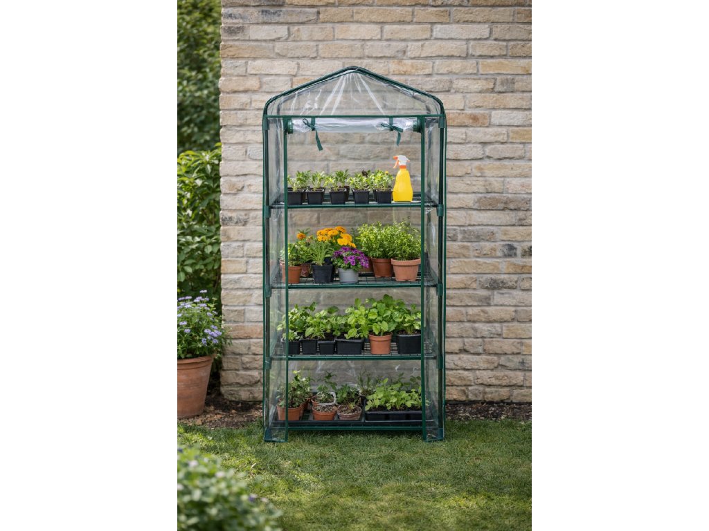 Prehľadné usporiadanie vďaka policámSúčasťou skleníka sú štyri praktické police, ktoré umožňujú efektívne využitie priestoru.