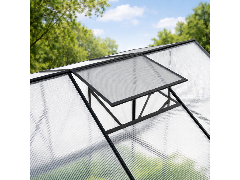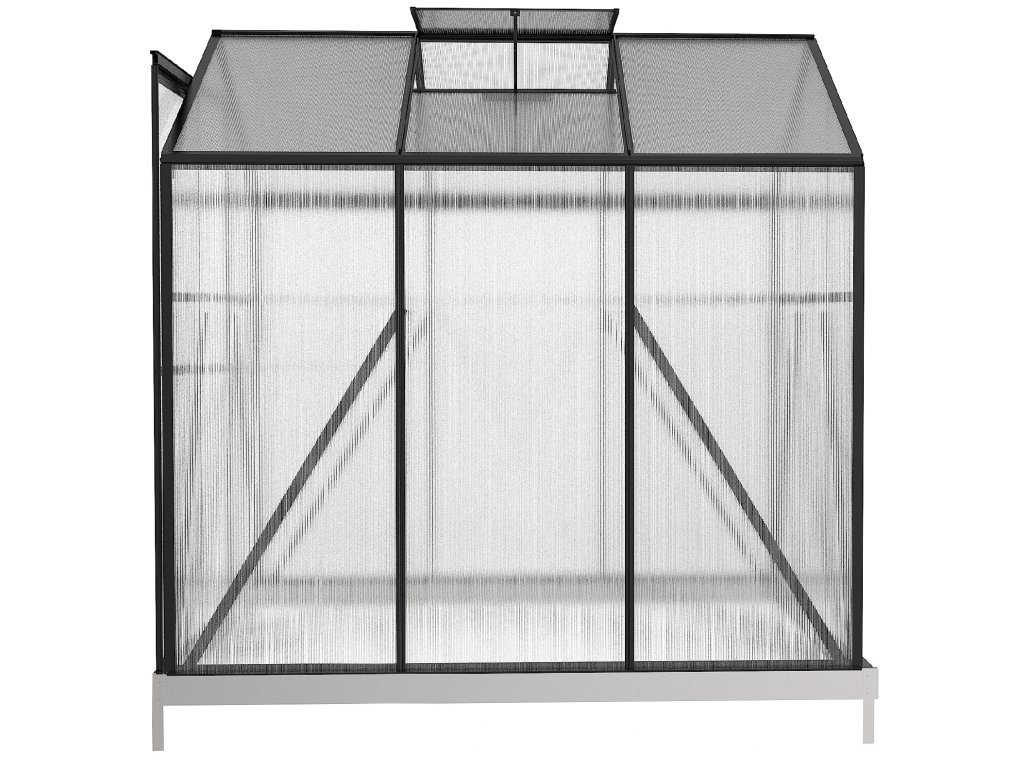 Praktické vetranie a pevný základSkleník je vybavený jednými posuvnými dverami na pohodlný vstup a jedným strešným ventilačným oknom na reguláciu teploty a vlhkosti. Súčasťou modelu je tiež základový rám, ktorý zvyšuje stabilitu celej konštrukcie. TIP: Pre maximálnu stabilitu odporúčame základový rám ukotviť k pevnému podkladu.