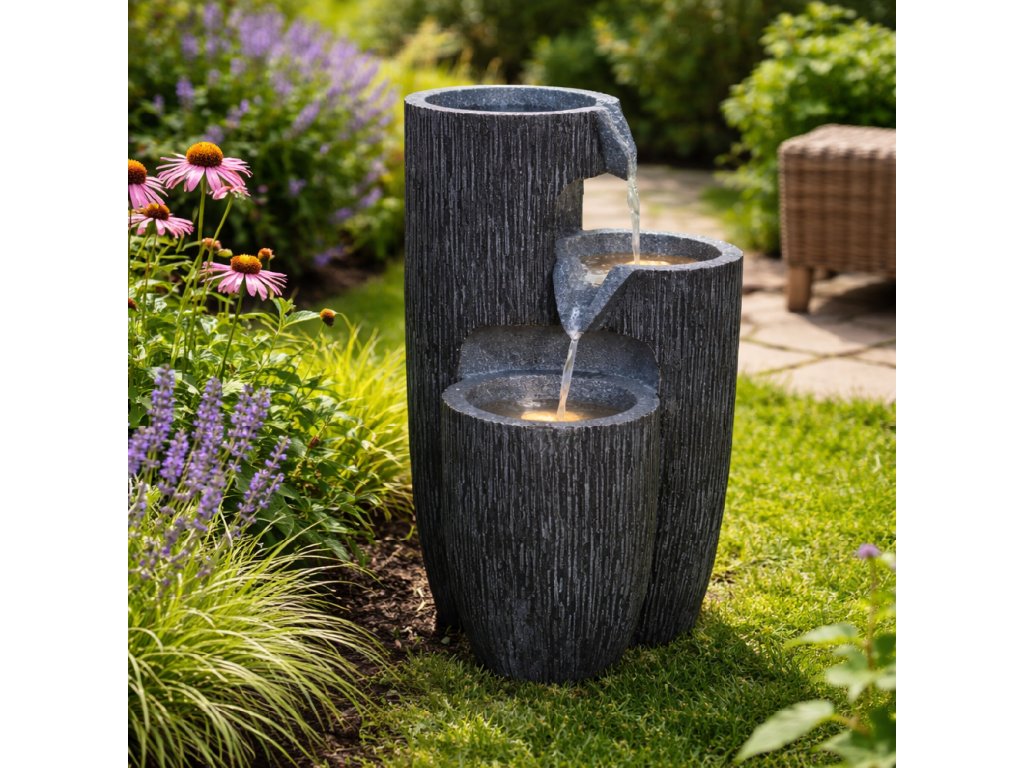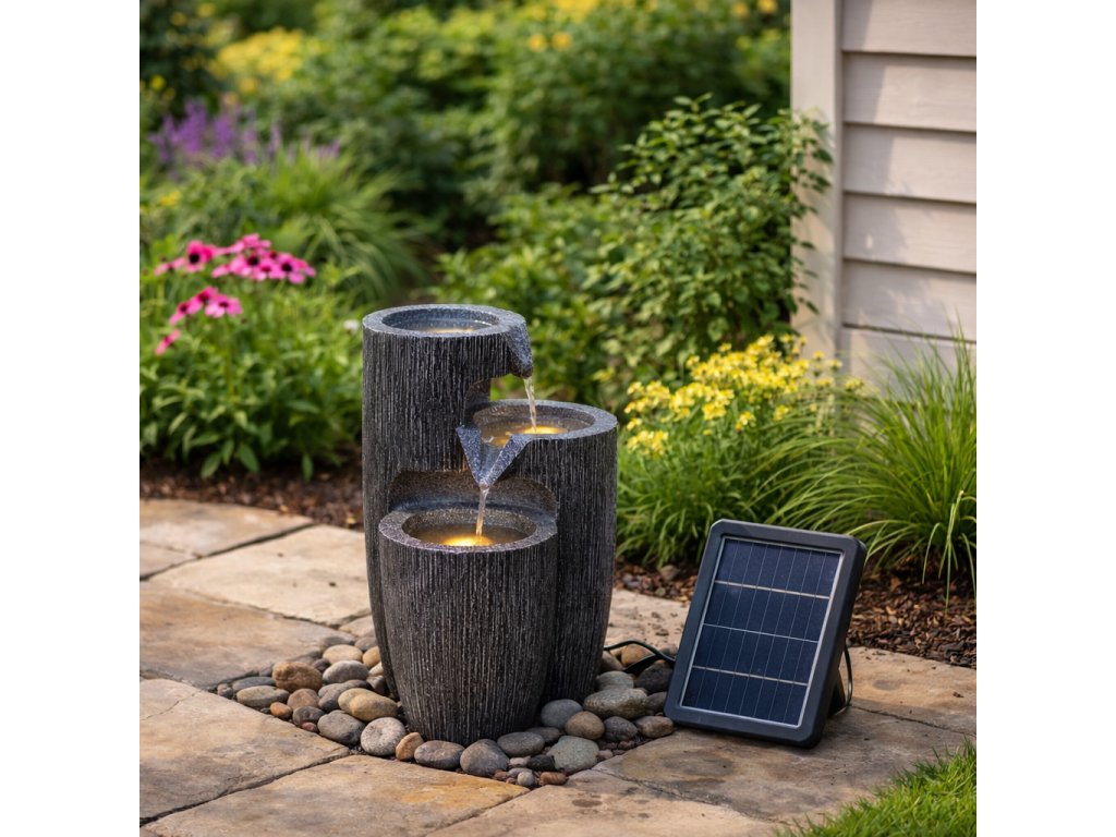 Chcete si ozdobiť záhradu a zároveň si pri sedení dobre oddýchnuť? Potom by vám nemala chýbať solárna záhradná fontána. Vďaka príjemným zvukom tečúcej vody vytvorí tú správnu relaxačnú náladu a oceníte ju aj vizuálne. Tri vzájomne prepojené džbány v elegantnom štýle krásne doplnia vašu záhradu. Večer vás poteší aj LED podsvietenie.