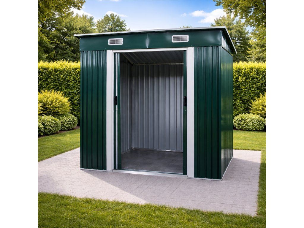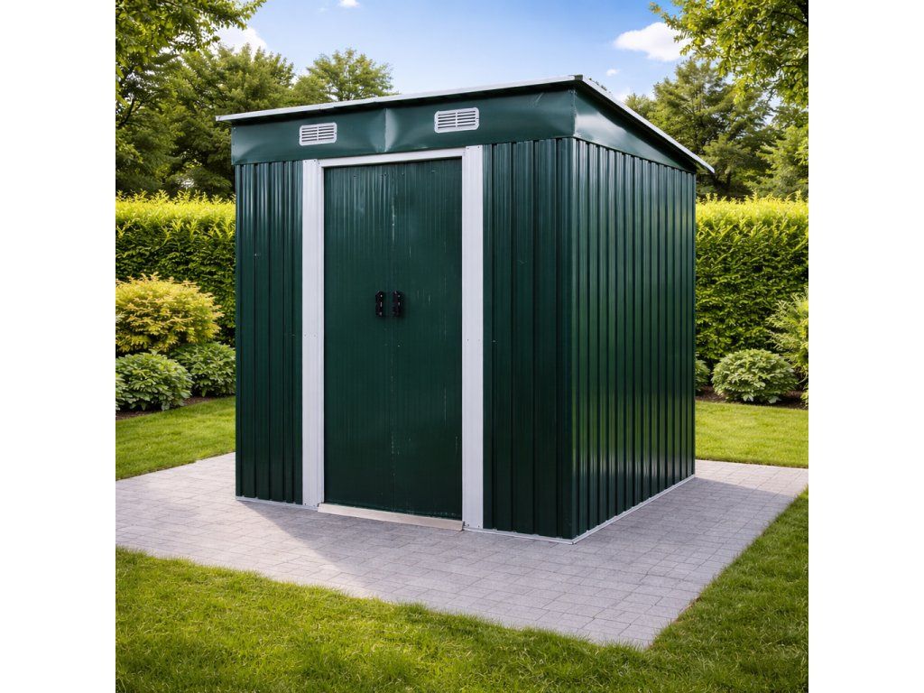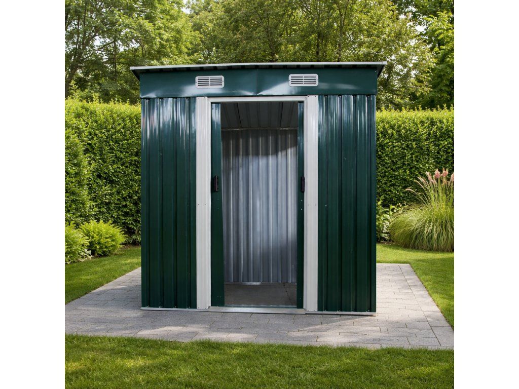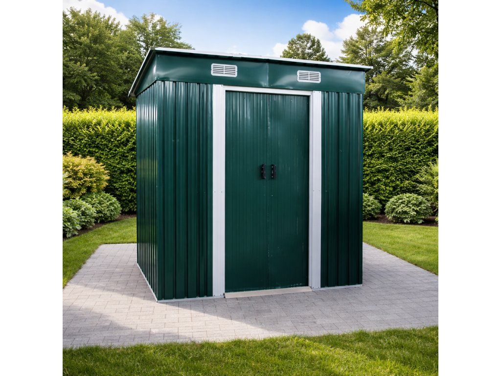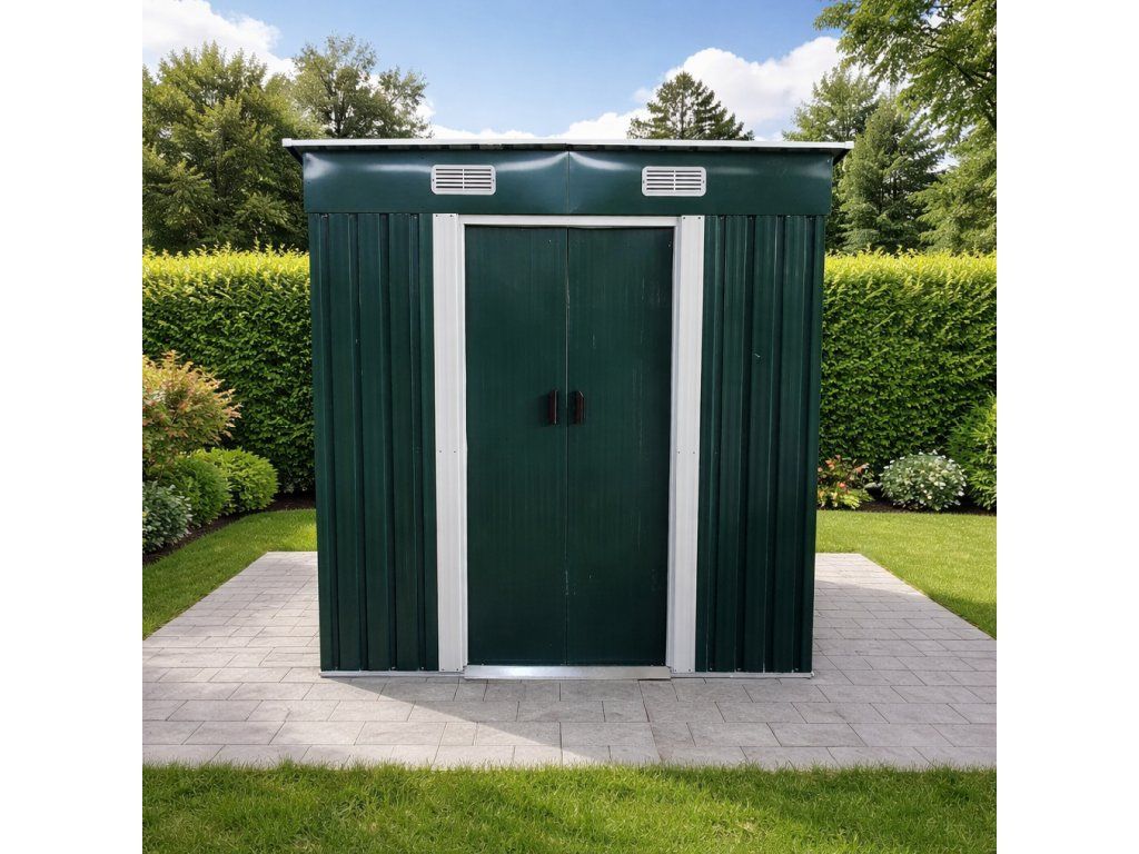 Moderný dizajn s praktickou pultovou strechouKovový záhradný domček v zelenom vyhotovení pôsobí elegantne a zároveň technicky čisto. Vďaka pultovej streche je zabezpečený efektívny odvod vody a snehu.